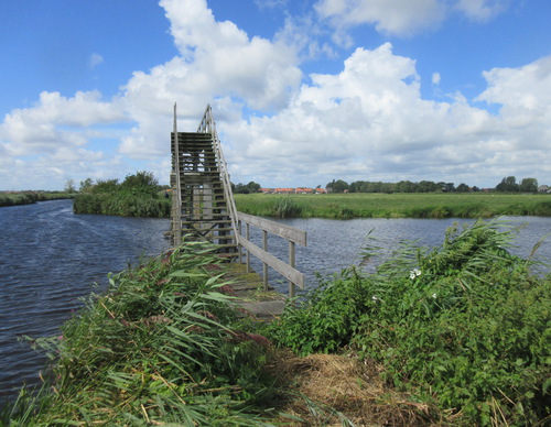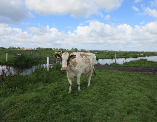 Maar hier geen mens te bekennen! Ook geen weidevogels trouwens, want die zijn al lang weer terug naar het zuiden. Het kan hier behoorlijk drassig worden, maar na de grote droogte van de afgelopen weken duurt het nog wel even voordat je weer laarzen nodig hebt om over te steken. Onderweg af en toe wat koeien, schapen, paarden en natuurlijk ganzen, die je inmiddels wel onze nieuwe nationale vogel mag noemen. Varkens komen we echter niet tegen. De naam Varkensland is gewoon bij toeval ontstaan, omdat iemand eens had geroepen dat het land zo slecht was dat je er zelfs geen varkens kon houden.