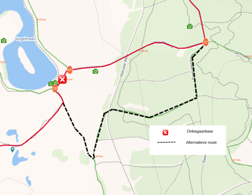 Bij knooppunt 26 kun je de omleiding naar keuzepunt 27 volgen. Zie de omleiding op de foto hieronder. Let op: deze omleiding is niet met bordjes en pijlen aangegeven. Gebruik dus goed de kaart om je weg te vinden. Halverwege de omleiding volg je de groene pijlen in noordelijke richting naar 27.