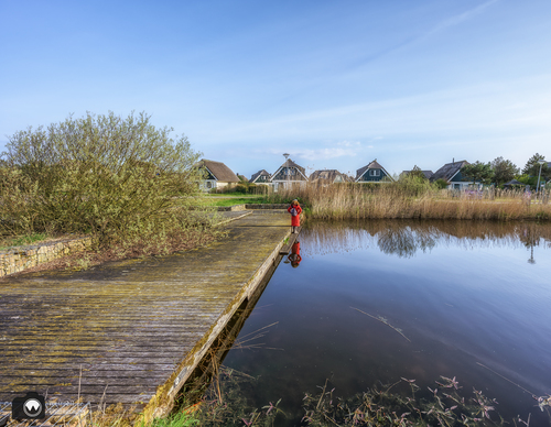 Vanaf de grote parkeerplaats wandelen we langs de vakantiebungalows richting de velden. Nadat we een paar stappen gelopen hebben komen we al langs spiegelend water, en dat is voor ons altijd een reden voor een fotomoment.