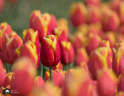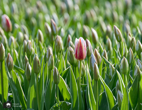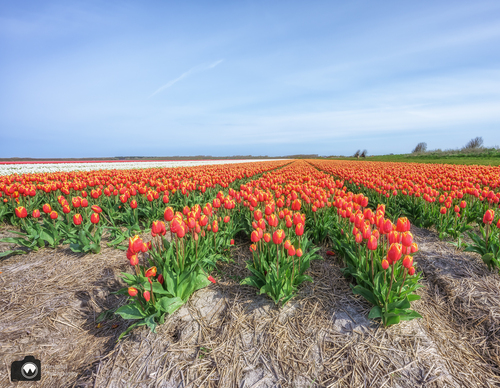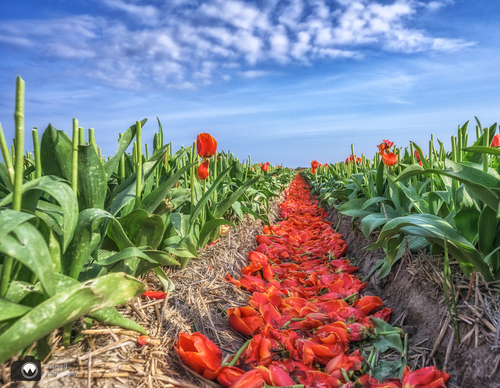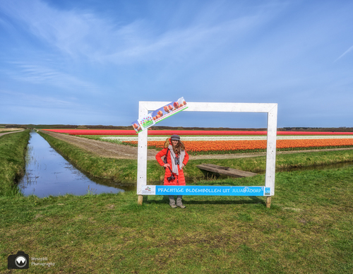 Verderop ligt een tulpenveld die tot onze teleurstelling al gekopt is. Maar, ondanks dat de tulpen niet meer in bloei staan levert het toch nog een prachtig plaatje op!
