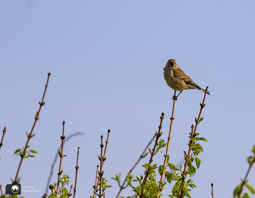 Een kneu (vrouwtje), of terwijl een common linnet.