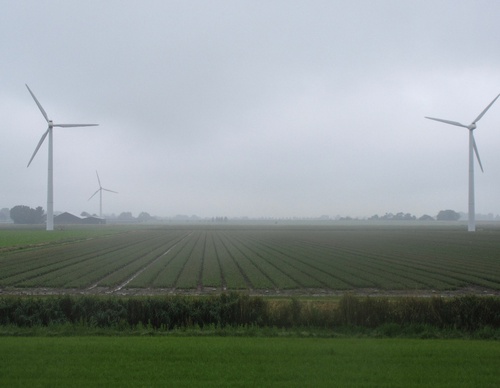 Niet vol te houden natuurlijk, zodat ik dankbaar gebruik maak van een dam die me naar een net ingezaaide akker met grasrand brengt waarover ik opgelucht verder wandel. Je loopt hier in de schaduw van enorme windmolens. In 2020 moet binnen de EU 24% van de opgewekte energie duurzaam zijn. Om dat doel te halen heeft Den Haag besloten dat er meer windmolens op land moeten worden gebouwd.