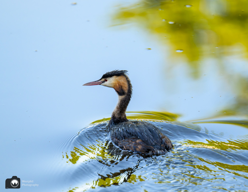 We moesten bij de brug rechts afslaan om een stukje langs de Houtvaart te wandelen. Ook hier zoeken we weer een plek om een mooie foto te maken. Er komt een fuut langs zwemmen, maar net als Adriaan een foto wil maken duikt hij onder. Aan de andere kant van de brug hebben we meer mazzel, want daar komt de fuut weer boven water.