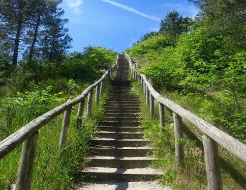Iets naar rechts zien we de trap waarlangs we straks bij terugkomst afdalen van een 53 meter hoge duintop vanwaar u bij helder weer een indrukwekkend uitzicht hebt over het Noord- Hollandse polderlandschap.