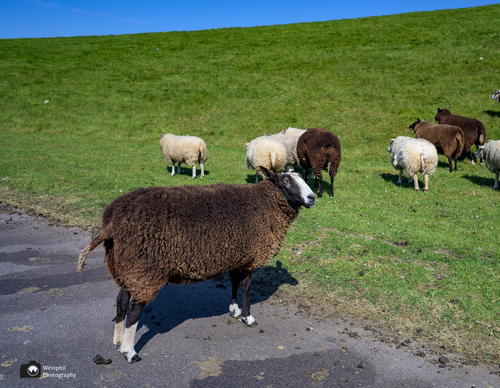 Het is heerlijk wandelweer vandaag. Lekker fris met een zonnetje. Als we links kijken, zien we de Waddenzee en rechts schapen met verderop een weide vol ganzen. We horen scholeksters, een tureluur en daar bovenuit het gakken van de ganzen. Als we in de buurt van de schapen zijn, loopt Adriaan even naar beneden om een goed gesprek met de schapen te voeren. Natuurlijk moeten ze poseren. Tot mijn verbazing blijven ze gewoon staan. Er is er zelfs één die zich laat aaien.
