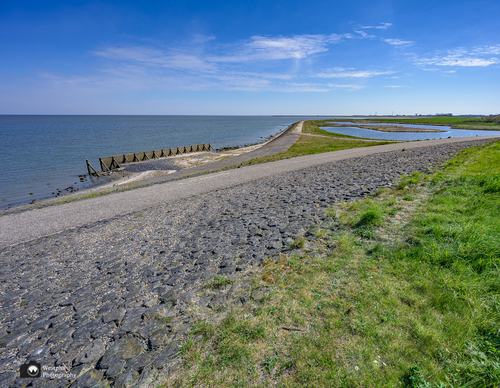 Wij kiezen ervoor om niet over de grasdijk te lopen, maar over het asfaltpad langs de zee. Al snel zijn we terug bij de oude stormkeringen, waar we begonnen zijn. We gaan de dijk over en zijn terug bij de auto.