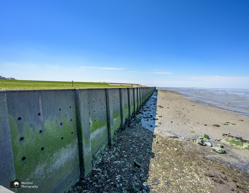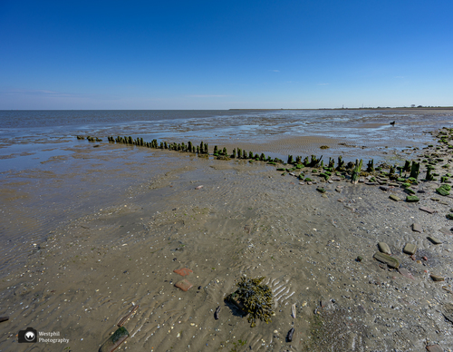 Als we ons eindelijk los kunnen scheuren van de vogeltjes en teruglopen langs het water, zien we dat het eb wordt. Net was het nog vloed, we hebben zeker erg lang naar de vogeltjes staan kijken. Natuurlijk moet het droogvallende wad ook op de foto.